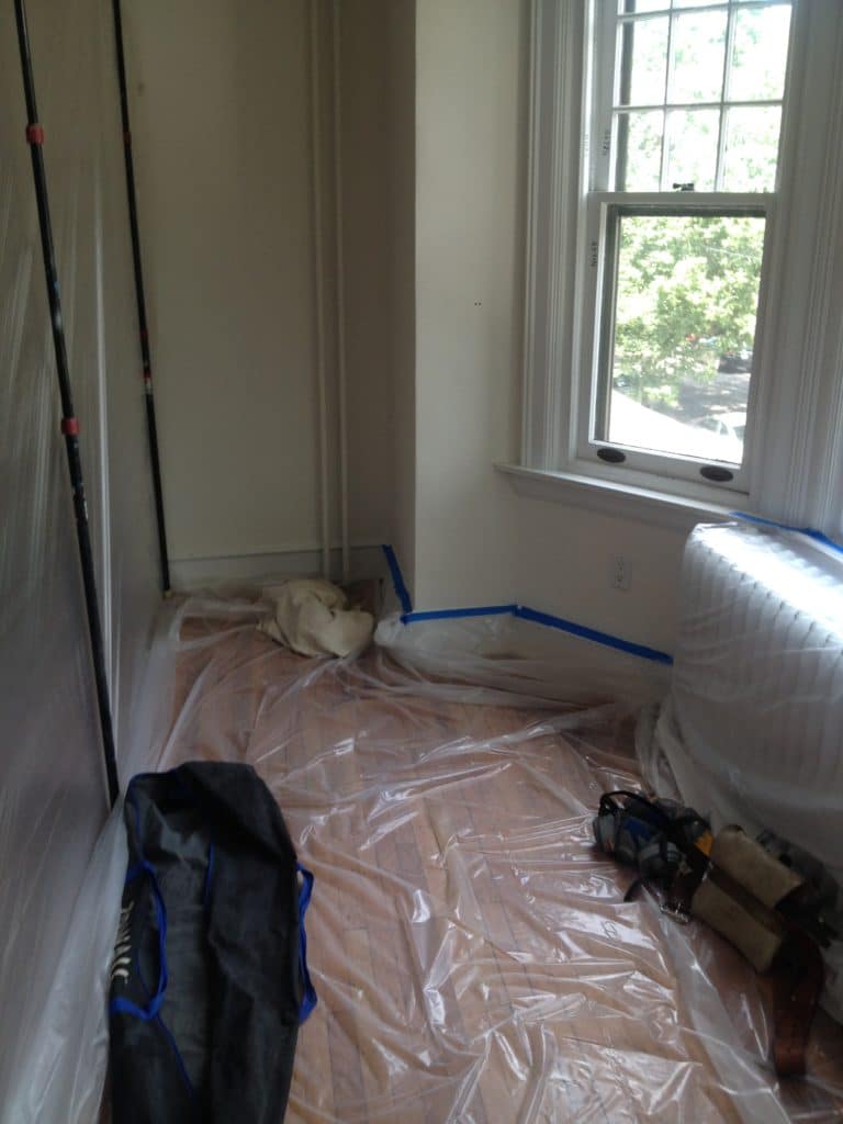 The window restoration process begins with removing the sashes from the openings. However, considering the likelihood of lead paint on the windows, the job really begins with prepping the site for containment. We are a lead-safe company and observe all lead-safe work practices. This requires us to plastic off all work areas to contain the dust. Once the sashes are removed we wrap them up in plastic for transport. We then address the channels within the window opening and remove all necessary paint. The windows are then taken back to our shop.